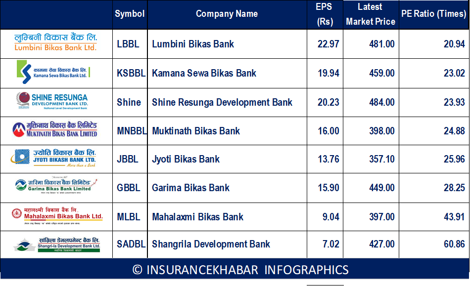 कात्तिक १४ गतेको बजारमूल्यलाई आधार मान्दा लुम्बिनी विकास बैंकको मूल्य आम्दानी अनुपात (पीई रेसियो) सबैभन्दा कम छ। लुम्बिनीको पीई रेसियो २०.९४ गुणा छ। दोस्रोमा कामना सेवाको २३.०२ गुणा र तेस्रोमा शाइन रेसुंगाको २३.९३ गुणा छ।