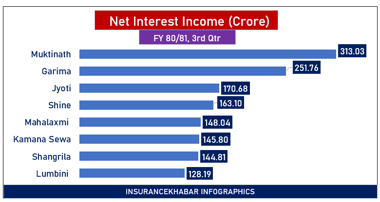 मुक्तिनाथ विकास बैंकले सर्वाधिक ३ अर्ब १३ करोड खुद व्याज आम्दानी गर्दा दोश्रोमा गरिमा विकास बैंकले २ अर्ब ५१ करोड खुद व्याज आम्दानी गरेको छ । सबै भन्दा थोरै खुद व्याज आम्दानी लुम्बिनी विकास बैंकले १ अर्ब २८ करोड गरेको छ।
