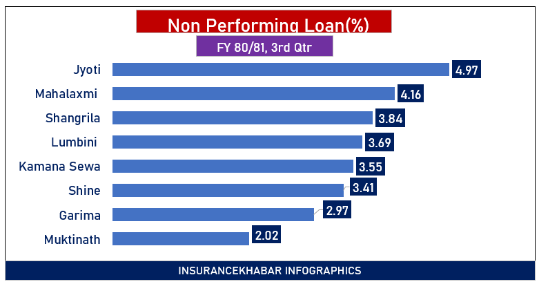 मुक्तिनाथ विकास बैंकको खराब कर्जा सबै भन्दा कम २ दशमलव ०२ प्रतिशत हुँदा दोश्रोमा गरिमा विकास बैंकको २ दशमलव ९७ प्रतिशत हुँदा ज्योति विकास बैंकको खराब कर्जा सबै भन्दा धेरै ४ दशमलव ९७ प्रतिशत छ ।