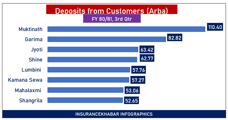 राष्ट्रिय स्तरका ८ विकास बैंकमध्ये मुक्तिनाथ विकास बैंकले सर्वाधिक १ खर्ब १० अर्ब ४० करोड निक्षेप संकलन गरेको छ भने दोश्रोमा गरिमा विकास बैंकले ८२ अर्ब ८२ करोड निक्षेप संकलन गर्दा सबै भन्दा कम सांग्रिला डेभलपमेन्ट बैंकले ५२ अर्ब ६५ करोड निक्षेप संकलन गरेको छ।