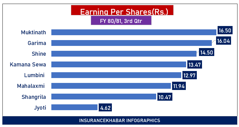 मुक्तिनाथ विकास बैंकको प्रति शेयर आम्दानी सर्वाधिक १६ रुपैयाँ ५० पैसा हुँदा दोश्रोमा गरिमा विकास बैंकको १६ रुपैयाँ ०४ पैसा छ ।
