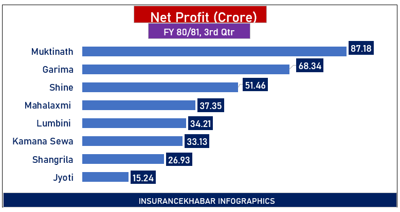 मुक्तिनाथ विकास बैंकले सर्वाधिक ८७ करोड १८ लाख खुद नाफा गरेको छ भने दोश्रोमा गरिमा विकास बैंकले ६८ करोड ३४ लाख खुद नाफा गरेको छ। सबै भन्दा थोरै खुद नाफा ज्योति विकास बैंकले १५ करोड २४ लाख गरेको छ ।