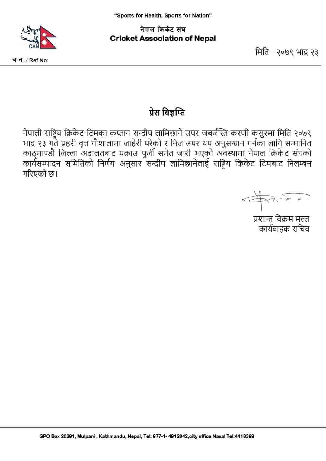 काठमाडौं । नेपाल क्रिकेट संघ (क्यान)ले क्रिकेटर सन्दीप लामिछानेलाई नेपाली राष्ट्रिय क्रिकेट टोलीको कप्तानबाट निलम्बन गरेको छ । १७ वर्षिय नाबालिगलाई जबरजस्ती करणी गरेको आरोप लागेका कप्तान लामिछानेविरुद्ध बिहीबार पक्राउ पूर्जी जारी भएसँगै आज बसेको क्यानको बैठकले उनलाई निलम्बन गरेको हो ।