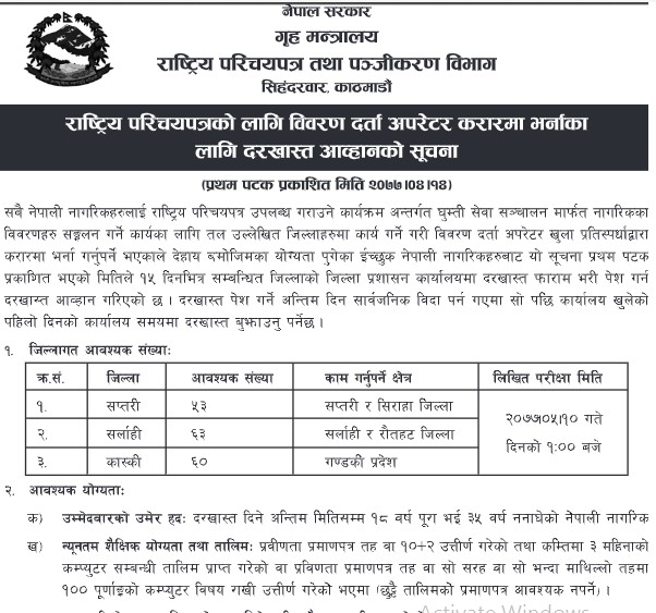 काठमडौं । राष्ट्रिय परिचयपत्र तथा पञ्जीकरण विभागले विभिन्न पदका लागि ठुलो संख्यामा कर्मचारीको माग गरेको छ । पञ्जीकरण विभागले सप्तरी,सर्लाही र कास्की जिल्लाका लागि १ सय ७६ जना कर्मचारीको माग गरेको जनाएको छ ।
