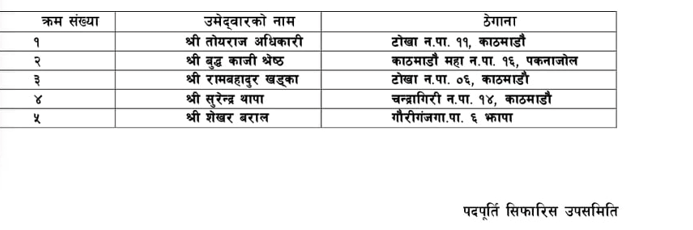 पदपुर्ति समितिले मंसिर १२ गते सार्वजनिक सूचना आह्वान गरेको थियो । उक्त सूचना अनुसार पेश भएका व्यक्तिहरु मध्येबाट शैक्षित योग्यता, कार्यानुभव र व्यवसायिक कार्ययोजना मूल्यांकनबाट प्राप्त गरेको अंकको आधारमा ५ जनाको नाम सिफारिस गरिएको हो । उक्त उपसमितिले यनिहरुलाई व्यवसायिक कार्ययोजनाको प्रतिस्तुतिकरण तथा अन्तर्वार्ताको लागि बोलाउने छन् । यसका लागि अहिलेसम्म मिति, समय र स्थानको निश्चित भइसकेको छैन ।