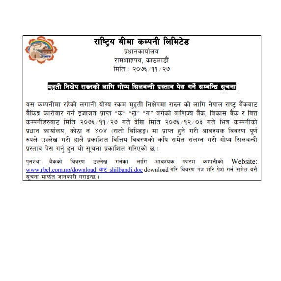 कम्पनीले वाणिज्य बैंक विकास बैंक, वित्त कम्पनीहरुहरुलाई मुद्धती निक्षेपमा लगानी गर्न प्रस्ताव गरेको हो । कम्पनीले मंगलबार सार्वजनिक सूचनामार्फत नेपाल राष्ट्र बैंकबाट इजाजत प्राप्त इच्छुक क, ख, ग वर्गका वाणिज्य बैंक, विकास बैंक, वित्त कम्पनीहरुलाई चैत्र ३ गतेसम्म गोप्य शिलबन्दी प्रस्ताव फारम बुझाउन आह्वान गरेको हो ।