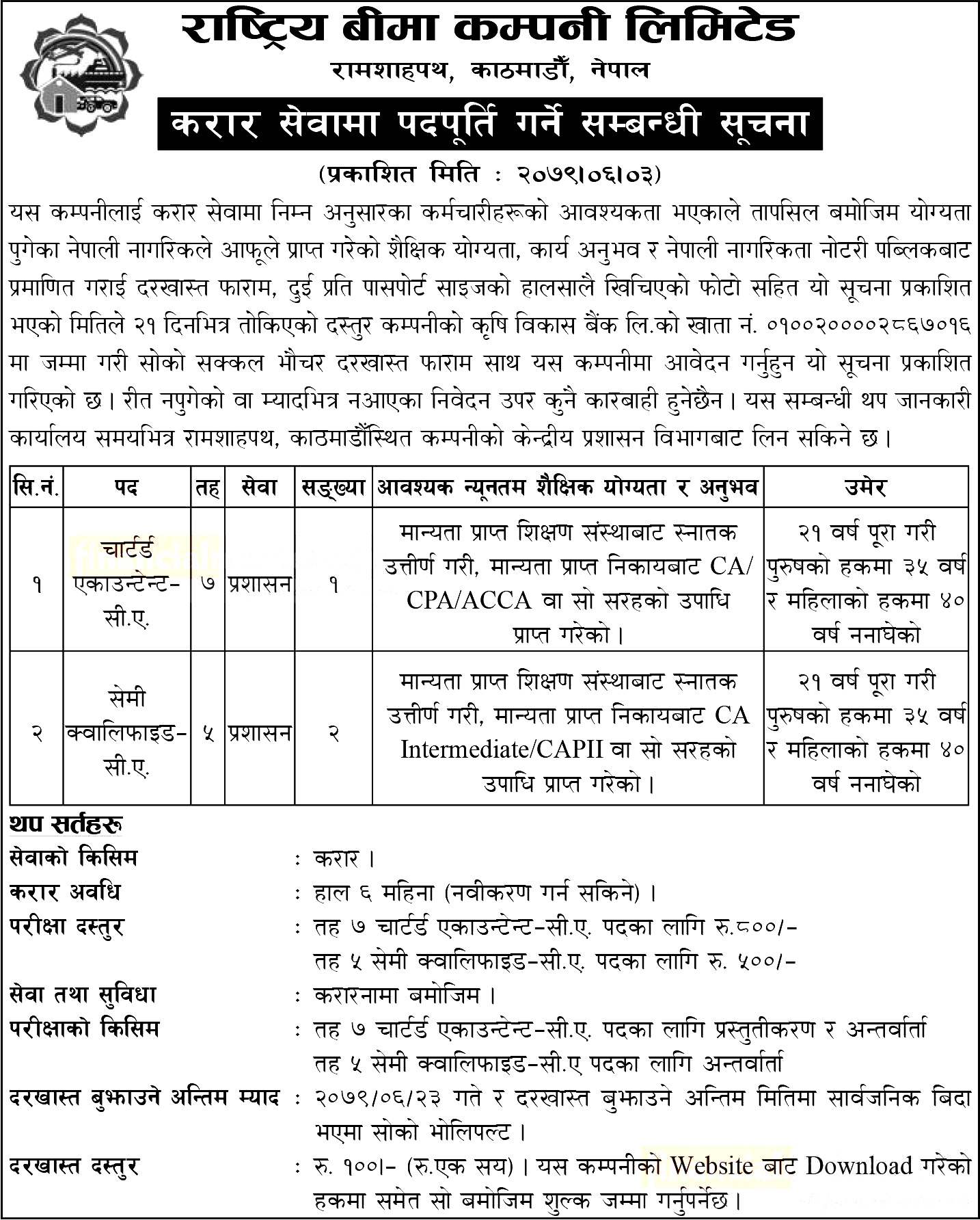 काठमाडौं । राष्ट्रिय बीमा कम्पनी लिमिटेडले करार सेवामा पदपुर्तिका लागि कर्मचारीको माग गरेको छ । कम्पनीले चार्टर्ड एकाउन्टेन्ट–सी.एका लागि एक जना, र सेमी क्वालिफाइड–सी.ए.का लागि २ जना गरी कुल ३ जना कर्मचारी माग गरेको हो ।