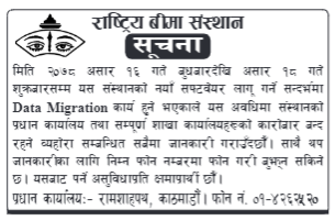काठमाडौं । राष्ट्रिय बीमा संस्थानबाट प्रवाह हुने बीमा सेवा तीन दिनका लागि बन्द हुने भएको छ । संस्थानमा नयाँ सफ्टवेयर लागु गर्न लागेको र त्यसको लागि डाटा माइग्रेसन गर्ने कार्य गर्नु पर्ने भएकाले तीन दिन कम्पनीबाट हुने सेवा तथा कारोबार बन्द हुने कम्पनीले एक सुचना जारी गर्दै जनाएको छ ।