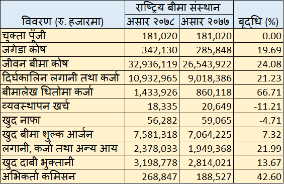 संस्थाले गत वर्ष खुद बीमा शुल्क आर्जन ७.३२ प्रतिशतले बृद्धि गरेको छ । यस अवधिमा खुद बीमा शुल्क आर्जन ७ अर्ब ५८ करोड रुपैयाँ रहेको छ । अघिल्लो वर्षको यहि अवधिमा ७ अर्ब ६ करोड रुपैयाँ थियो ।