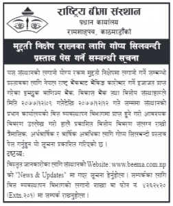 बैंक तथा वित्तीय संस्थाहरुले आजदेखि चैत १२ गतेसम्म संस्थानको प्रधान कार्यालयको वित्त व्यवस्थापन विभागमा प्राप्त हुने गरि आवस्यक विवरण उल्लेख गरी हालै प्रकाशित वित्तीय विवरणल संलग्न राखी त्रैमासिक, अर्धवार्षिक र वार्षिक अवधिका लागि गोप्य सिलबन्दी प्रस्ताव पेश गर्न सार्वजनिक सूचना जारी गरेको छ ।