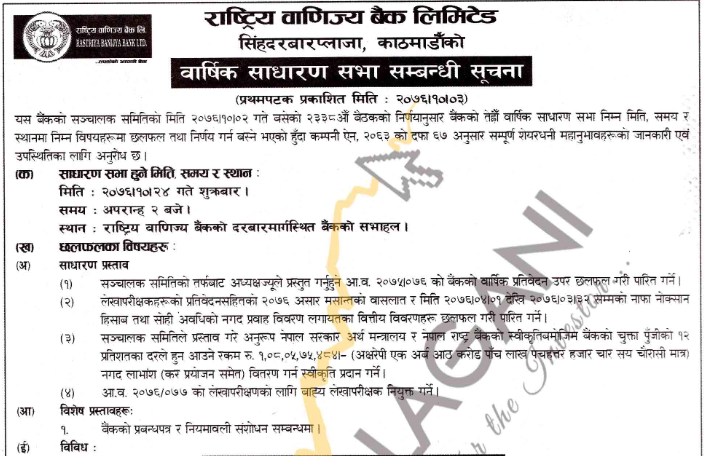 शेयरधनीहरुको उपस्थिति पुस्तिकामा दस्तखत गर्न शेयरधनी उपस्थिति पुस्तिका बिहान १२ बजेदेखि १ बजेसम्म खुला गरिने समेत बैंकले जनाएको छ ।