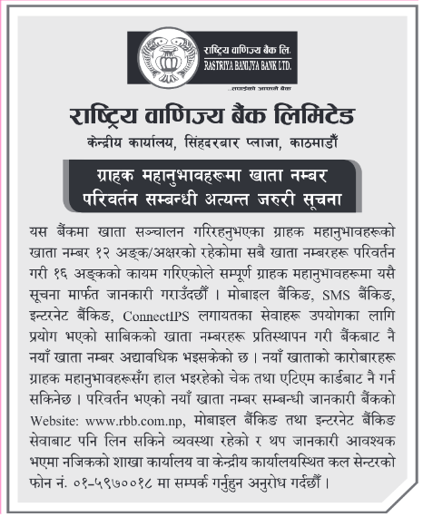 काठमाडौं । राष्ट्रिय वाणिज्य बैंकले आफ्ना सबै ग्राहकको खाता नम्बर परिवर्तन गरेको छ । बैंकले यस अघि १२ अंकको खाता नम्बर थियो सोही खाता नम्बरपरिवर्तन गरेर १६ अंकको बनाएको जनाएको छ ।