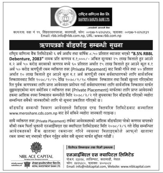 बैंकले आरबिबि डिबेञ्चर, २०८३ नामको कुल ऋणपत्रमध्ये सार्वजनिक निष्काशन मार्फत विक्री गरेको १० लाख कित्ता सर्वसाधारणलाई र व्यक्तिगत तर्फबाट विक्री गरेको १५ लाख कित्ता विभिन्न व्यक्ति तथा संघसंस्थाहरुलाई बाँडफाँड गरेको हो ।