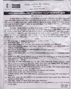 बैंकले करार सेवामा ११ जना विशेषज्ञको माग गरेको छ भने सेवा अवधि भने १ वर्ष रहनेछ । आवेदकको योग्यता भने मान्यता प्राप्त शैक्षिक संस्थाबाट चार्टड एकाउन्टेन्सी उपाधि हासिल गरेको हुनुपर्नेछ । साथै काम गरेका र अनुभव भएकालाई विशेष प्राथमिकतामा दिइने बैंकले जनाएको छ । विज्ञापन मार्फत नियुक्त हुने करार विशेषज्ञहरुले बैंकको विभिन्न विभाग तथा कार्यालयमा रहि काम गर्नुपर्नेछ ।