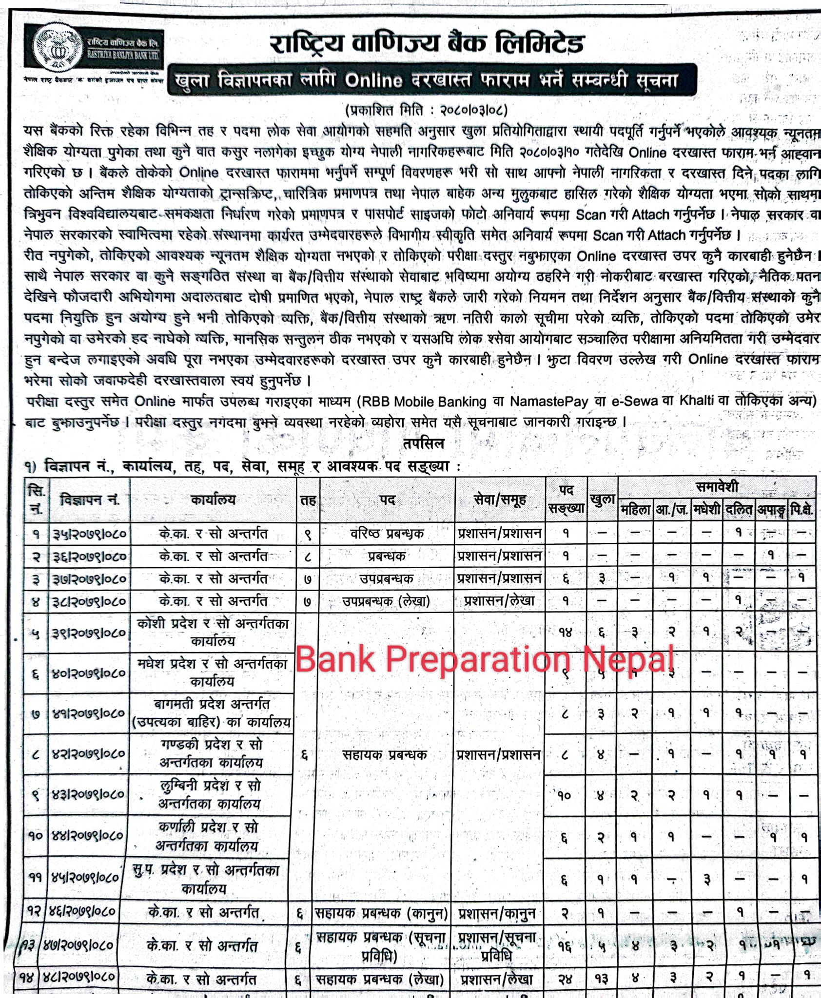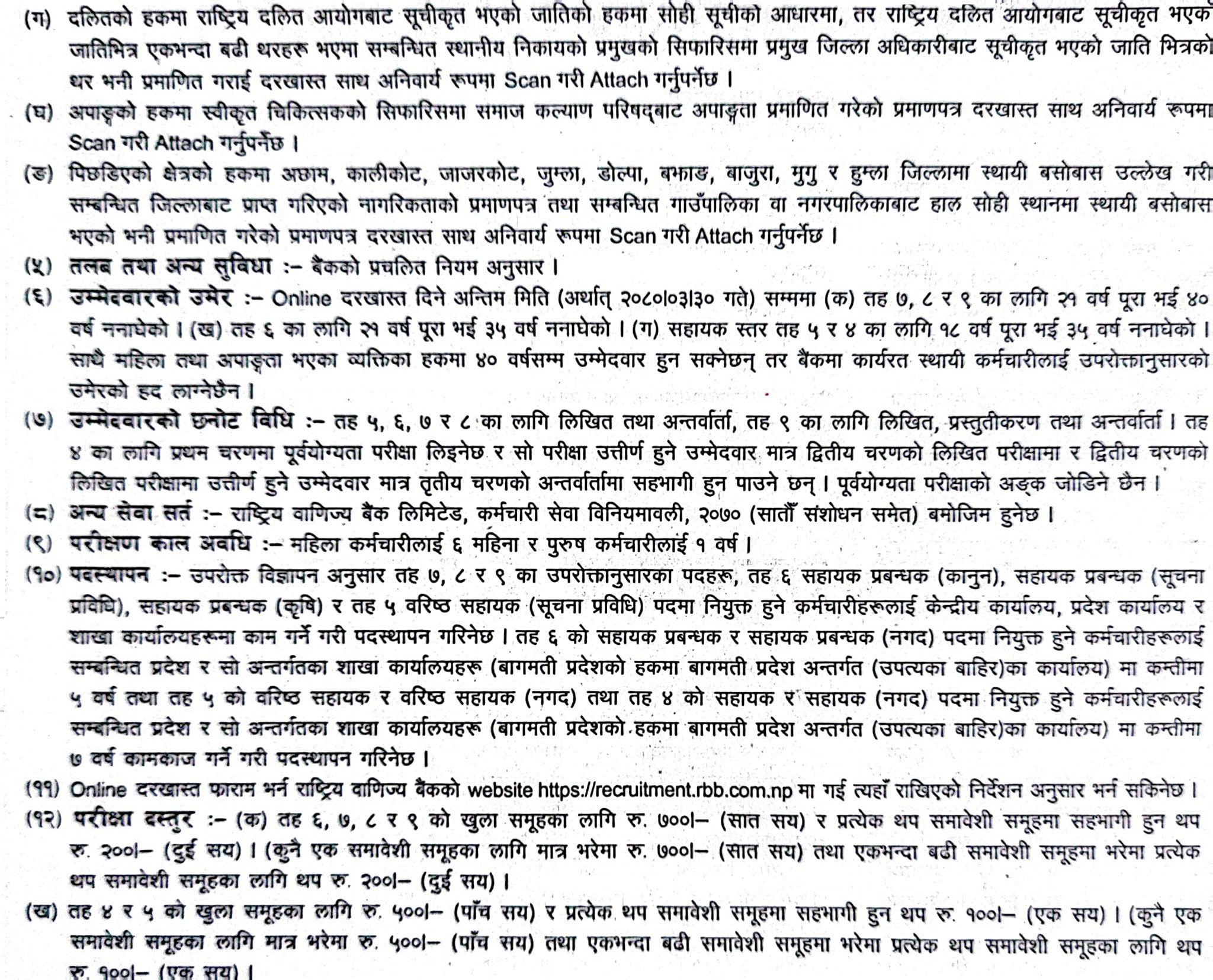 बैंकले योग्य तथा इच्छुक आवेदकहरुलाई असार १० गतेदेखि असर ३० गतेसम्म आवेदन दिन आग्रह गरेको छ । साथै दोब्बर दस्तुर तिरेर साउन ६ गतेसम्म आवेदन दिन सकिने बैंकले जनाएको छ । बैंकले तह ४ को सहायकको लागि दश जोड २२ को योग्यता तोकेकोले १२ पासले पनि आवेदन दिन सक्ने छन् । बैंकले आफ्नो हेड अफिस तथा विभिन्न शाखा कायाृलयका लागि कर्मचारी माग गरेको हो ।