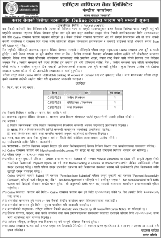 ईच्छुक तथा योग्यता पुगेका नेपाली नागरिकलाई विज्ञापन प्रकाशित भएको मितिले १५ दिन भित्र आवेदन दिन अर्थात मंसिर ६ गते भित्र आवेदन दिन बैंकले आग्रह गरेको छ ।