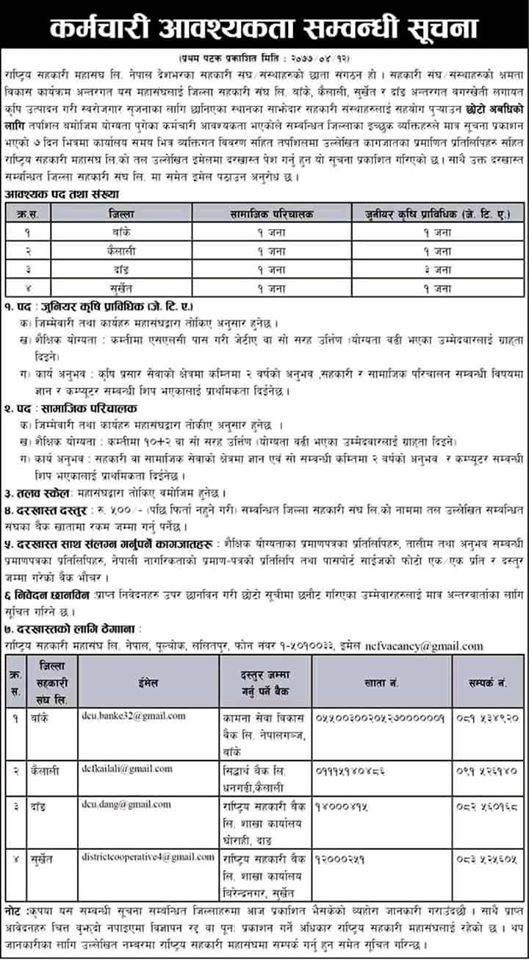 जूनियर कृषि प्राविधिकका लागि र सामाजिक परिचालकको लागि कर्मचारीको माग गरिएको बताएको छ । ईच्छुक तथा योग्यता पुगेकाले राष्ट्रिय सहकारी महासंघमा सम्पर्क गर्न अनुरोध गरेको छ ।