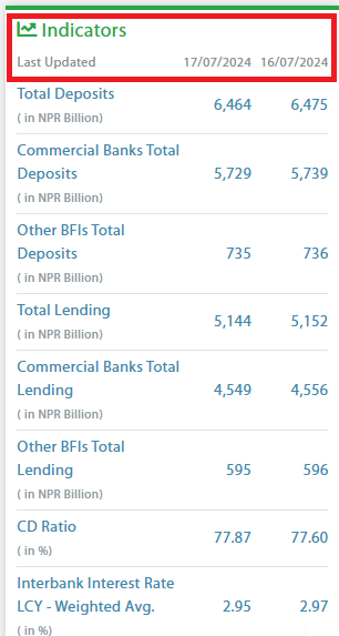आज पनि राष्ट्र बैंकको वेबसाइट हेर्ने हो भने जुलाई १७ अर्थात असार २ गतेसम्मका वित्तीय सूचकहरु अपडेट गरिएको छ। जब कि आज असार ८ गते भइसकेको छ।