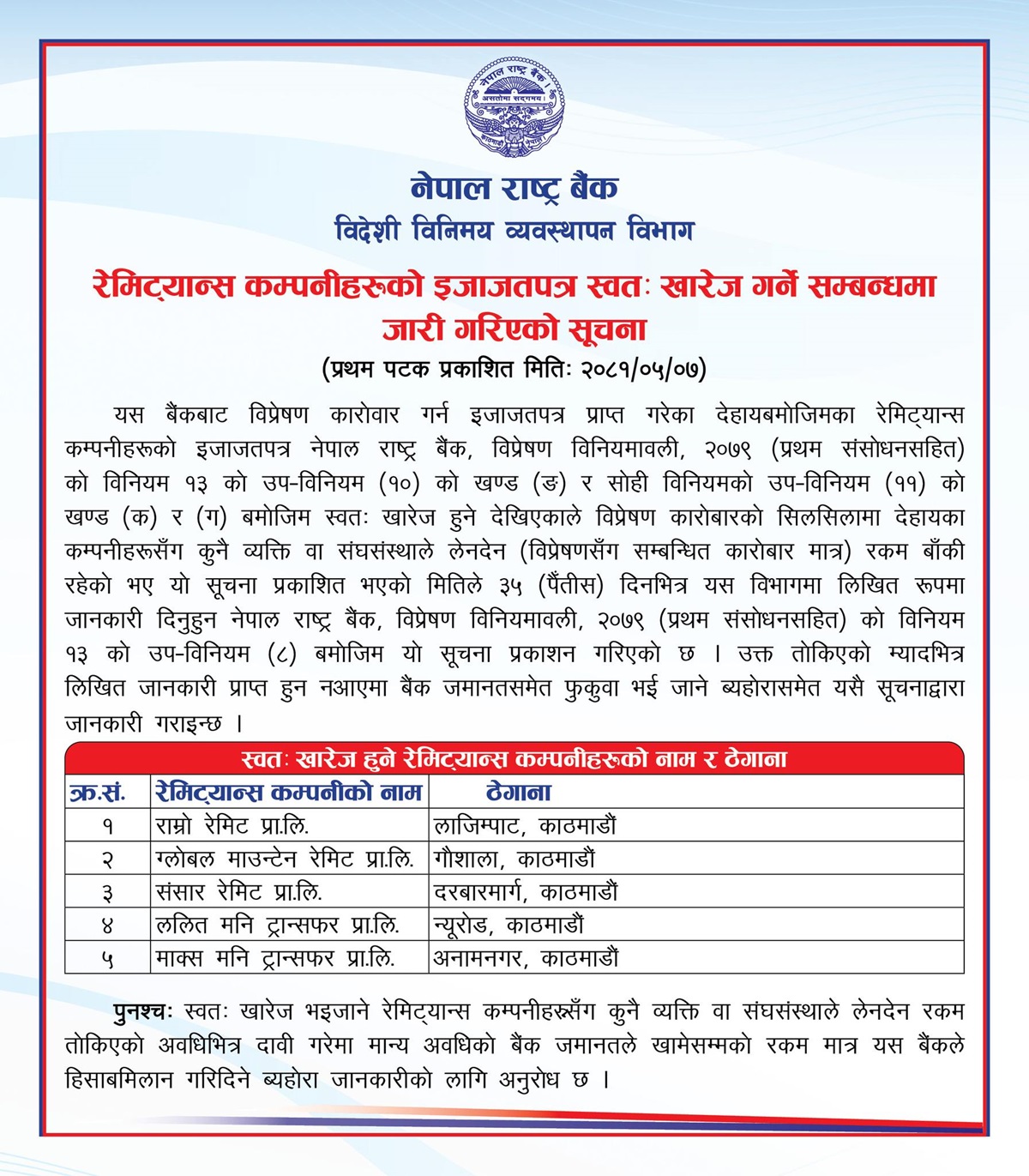 केन्द्रीय बैंकले आज एक सूचना जारी गर्दै ती कम्पनीको लाइसेन्स विप्रेषण विनियमावली, २०७९ (प्रथम संशोधनसहित)को विनियम १३ को उपविनियम (१०) को खण्ड (ङ) र सोही विनियमको उपविनियम (११)को खण्ड (क) र (ग) बमोजिम स्वतः खारेज भएको जानकारी गराएको हो। लाइसेन्स खारेज भएका रेमिट्यान्स कम्पनीहरुमा काठमाडौंको लाजिम्पाटस्थित राम्रो रेमिट, गौशालाको ग्लोबल माउन्टेन रेमिट, दरबारमार्गको संसार रेमिट, न्युरोडको ललित मनी ट्रान्सफर र अनामनगरको माक्स मनी ट्रान्सफर छन्।