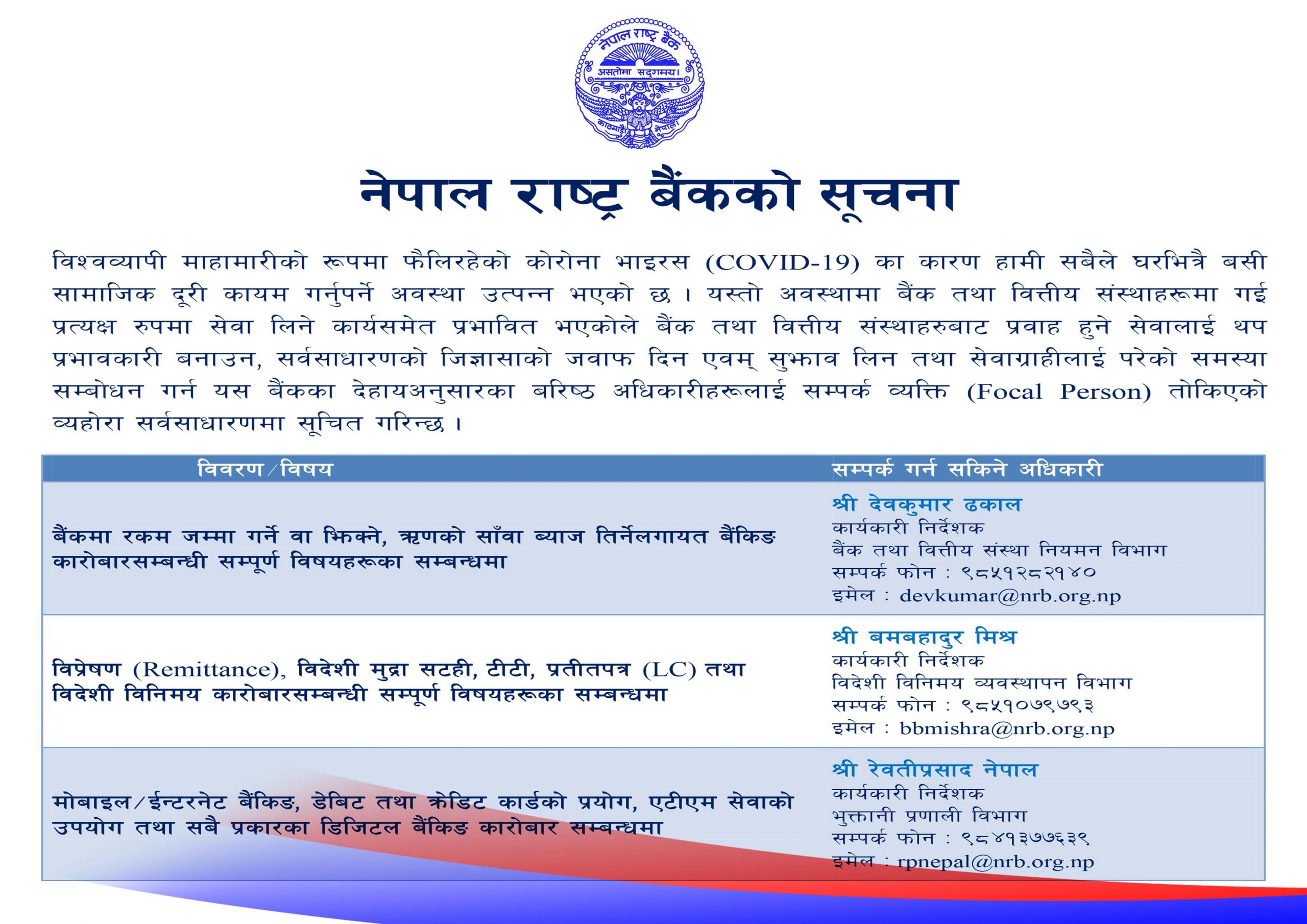 राष्ट्र बैंकले तीन कार्यकारी निर्देशकलाई फोकल पर्सनका रुपमा नियुक्त गरी उनीहरुको मोवाइल नम्बर समेत सार्वजानिक गर्दै बैंक तथा वित्तिय संस्थाहरुले गडबढ गरेमा गुनासो गर्न भनिएको छ । राष्ट्र बैंकले वित्तीय संस्थाबाट प्रवाह हुने सेवाको सम्बन्धमा सर्वसाधारणबाट सिधैं गुनासो सुनेर एक्सनमा जान टास्कर्फो गठन गरिएको केन्द्रीय बैंकले जनाएकोे छ ।