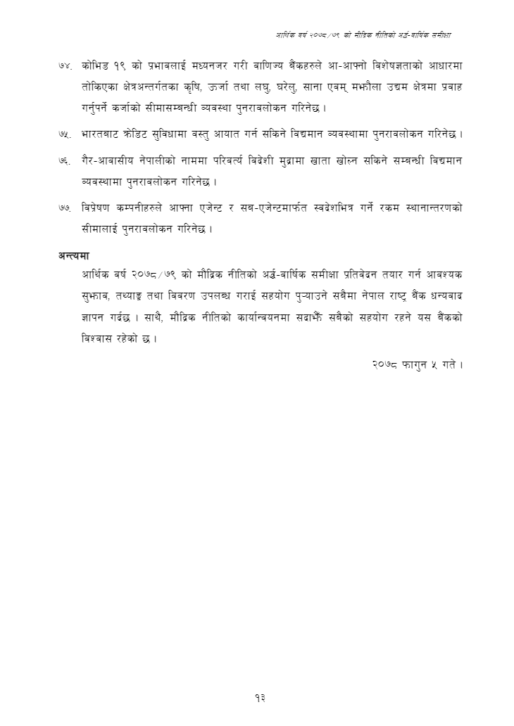 भारतबाट क्रेडिट सुविधामा बस्तु आयात गर्न सकिने विद्यमान व्यवस्थामा पुनरावलोकन गरिने भएको छ । गैर आवासीय नेपालीको नाममा परिवर्त्य विदेशी मुद्रामा खाता खोल्न सकिने सम्ब्न्धी विद्यमान व्यवस्थामा पुनरावलोकन गरिने भएको छ । ,