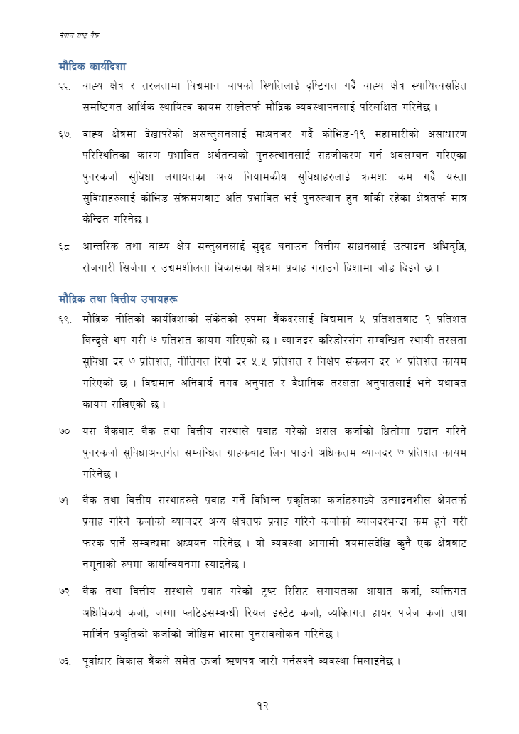 कोभिड १९ को प्रभावलाई मध्यनजर गरी बाणिज्य बैंकहरुले आ आफ्ना विशेषज्ञताको आधारमा तोकिएको क्षेत्रअन्तर्गतका कृषि, उर्जा तथा लघु घरेलु, साना एवम् मझौला उद्यम क्षेत्रमा प्रवाह गर्नुपर्ने कर्जाको सीमासम्बन्धी व्यवस्था पुनरावलोकन गरिने भएको छ ।