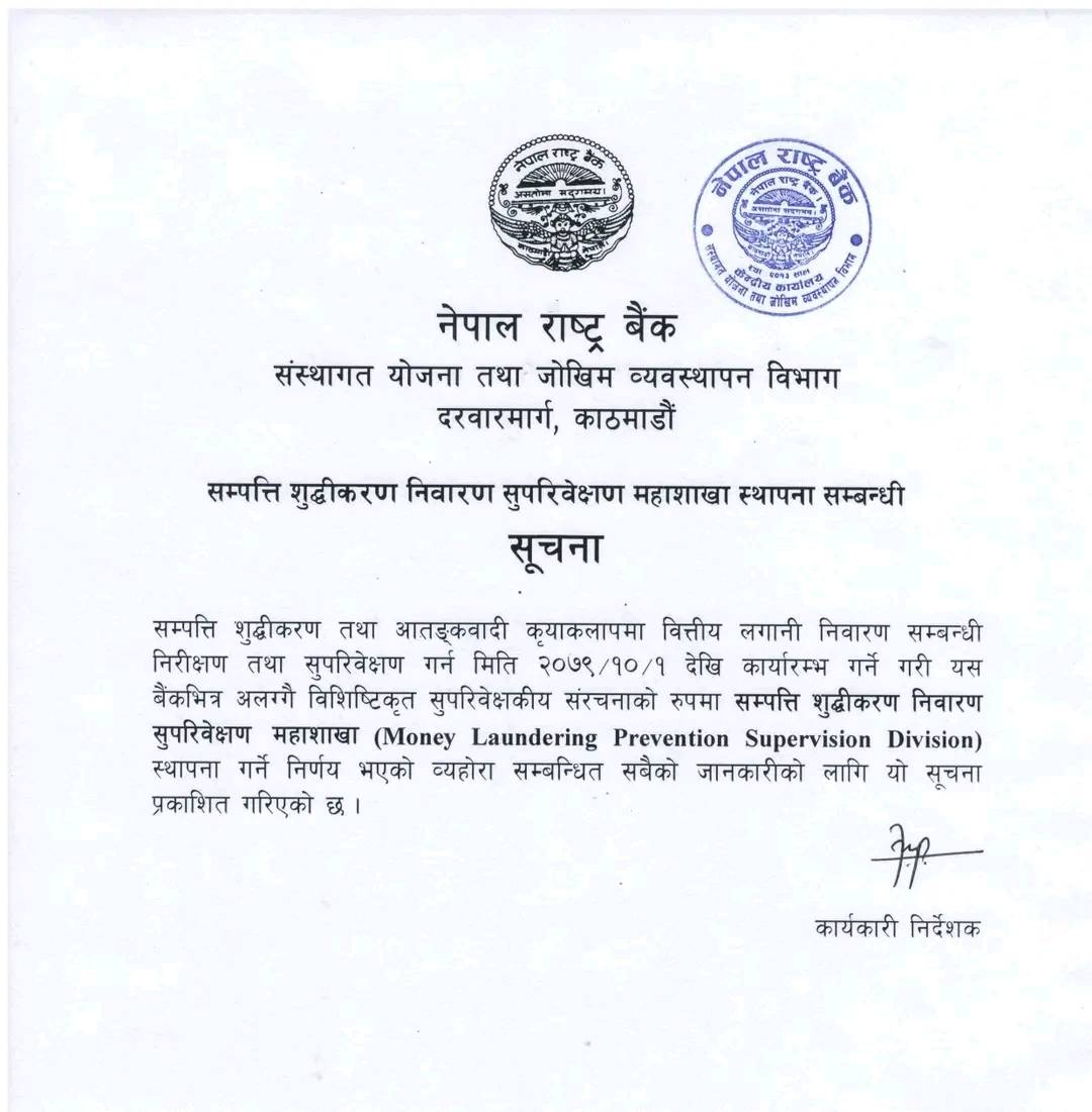 सम्पत्ति सुद्धीकरण तथा आतङकवादी क्रियाकलापमा वित्तीय लगानी निवारण सम्बन्धी निरीक्षण तथा सुपरिवेक्षण गर्नको लागि यस महाशाखाको स्थापना गर्न लागेको राष्ट्र बैंकले जनाएको छ ।