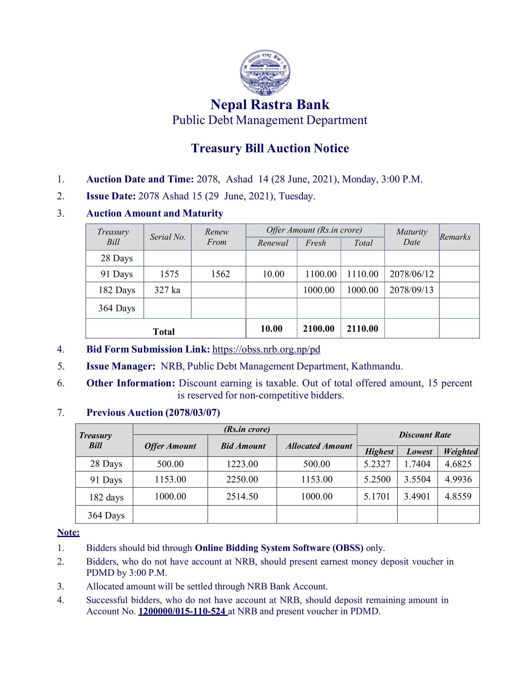 राष्ट्र बैंकका अनुसार यस ट्रेजरी बिल आज असार १४ गते दिउँसो ३ बजे बोलकबोल भएर भोलि बिक्री हुने राष्ट्र बैंकले जनाएको छ ।