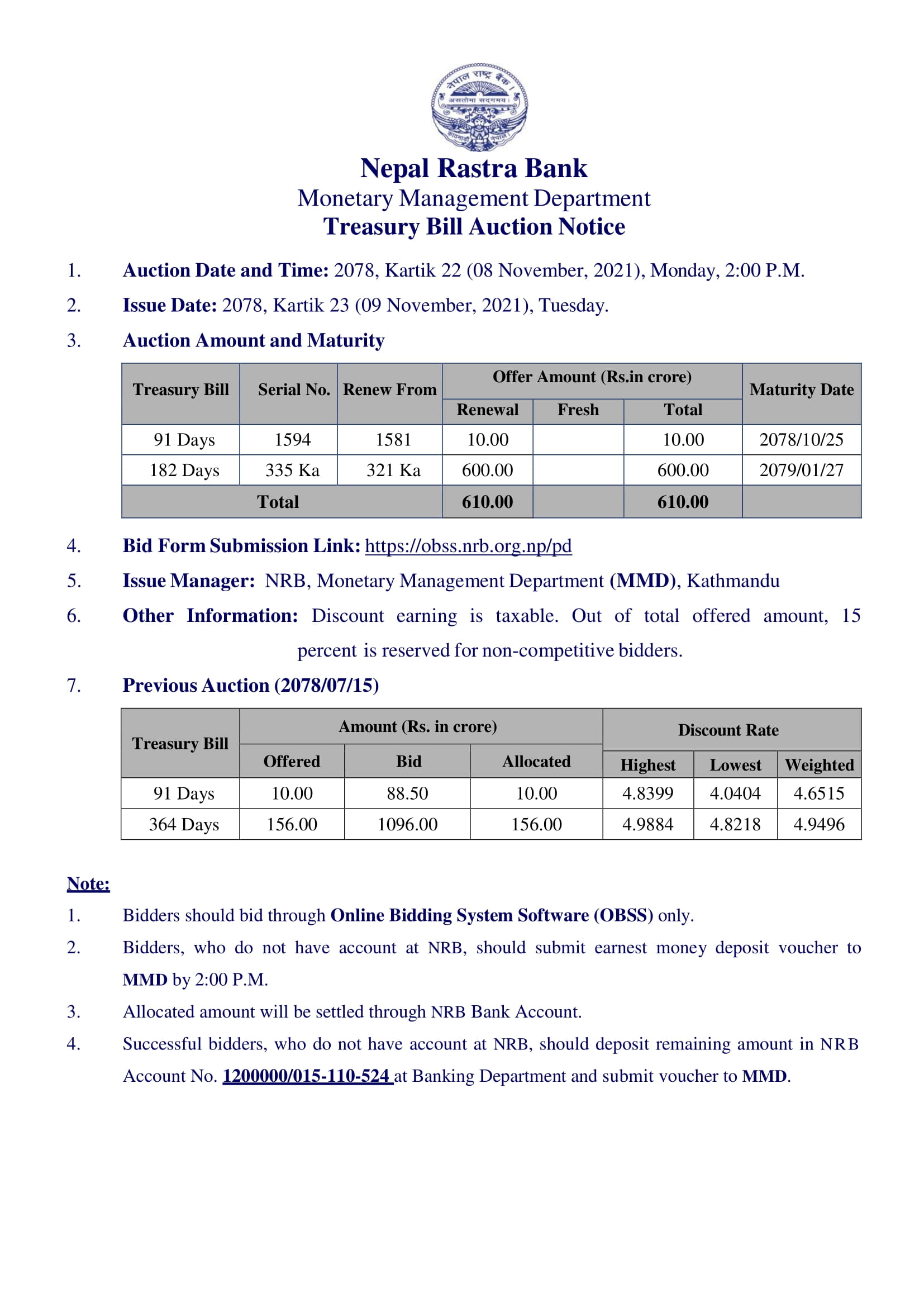 त्यस्तै, बैंकले १८२ दिनको अवधिको लागि ६ अर्ब रूपैयाँ बराबरको ट्रेजरी बिल बिक्री गर्न लागेको हो । उक्त ट्रेजरी बिल २०७९ साल वैशाख २७ गते परिपक्क हुनेछ । यस ट्रेजरी बिल भोलि कार्तिक २२ गते, दिउँसो २ बजे बोलकबोल भएर कार्तिक २३ गते, मंगलबार बिक्री हुने समेत राष्ट्र बैंकले यसै सुचनामा उल्लेख गरेको छ ।