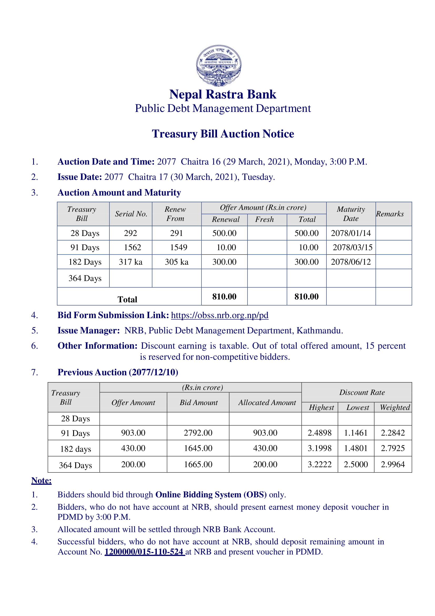 बैंकले ९१ दिनको अवधिको लागि १० करोड रूपैयाँ बराबरको ट्रेजरी बिल बिक्री गर्न लागेको हो । उक्त ट्रेजरी बिल २०७८ साल असार १५ गते परिपक्क हुनेछ ।