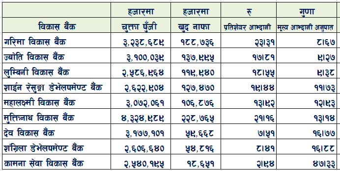 ९ राष्ट्रिय स्तरक विकास बैंक मध्य गरिमा विकास बैंकको मूल्य  आम्दानी अनुपात सबै भन्दा न्यून छ।  गरिमा विकास बैंकको मूल्य आम्दानी अनुपात ८ दशमलव ६७ गुणा छ। त्यस्तै लाभांश प्रस्ताव गरेर बुक क्लोज आउँन बाँकी भएपनि ज्योति विकास बैंकको मूल्य आम्दानी अनुपात ९ दशमलव २७ गुणा रहेको छ। सामान्यत कम मूल्य आम्दानीलाई दोश्रो बजारमा अण्डरभ्यालूड मानिन्छ।