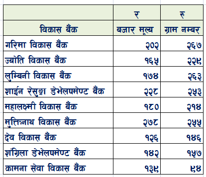 राष्ट्रिय स्तरका  विकास बैंक मध्य कैलाश विकास बैंक र गण्डकी विकासको शेयर कारोवार  रोकिएको छ।  वाणिज्य बैंकसंग प्राप्ति प्रक्रियामा रहेकाले दुवै विकास बैंकको शेयर कारोवार रोकिएको छ।