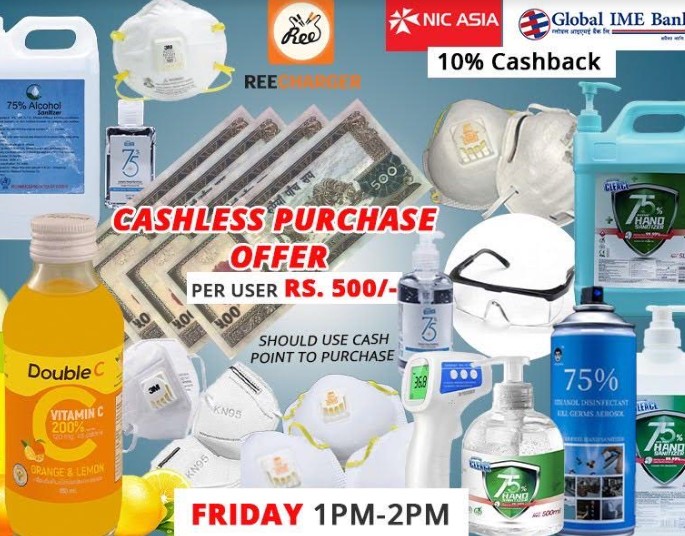 रिचार्जरले जेठ २३ गते शुक्रबारका दिन मध्यान्ह १ बजेदेखि १ घण्टाको अवधिमा आफ्ना प्रयोगकर्तालाई क्यासलेस पर्चेज अफर अन्तरगत ५ सय रुपैंया बराबरको सामान निशुल्क उपलब्ध गराउन लागेको हो । यसरी अर्डर हुने सामान डेलिभरी पनि निशुल्क हुनेछ । ग्लोबल की टेक्नोलोजीका अध्यक्ष अलाइभ ग्लाइडरका अनुसार क्यासलेज पर्जेज अफरमा रिचार्जरका प्रयोगकर्ताको खातामा रहेको क्यास प्वाइन्टलाई रिडिम गरेर सित्तैंमा सामान उपलब्ध गराउने छ ।