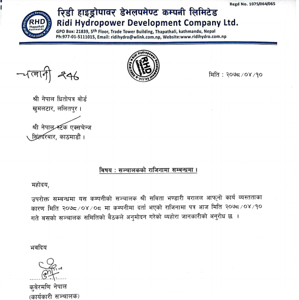 काठमाडौं । रिडी हाइड्रोपावर डेभलपमेण्ट कम्पनी लिमिटेडकी सञ्चालक सबिता भण्डारी बरालको राजिनामा स्वीकृत भएको छ । कम्पनीको साउन १० गते बसेको सञ्चालक समितिको बैठकले उनले दिएको राजिनामा स्वीकृत गरेको हो ।