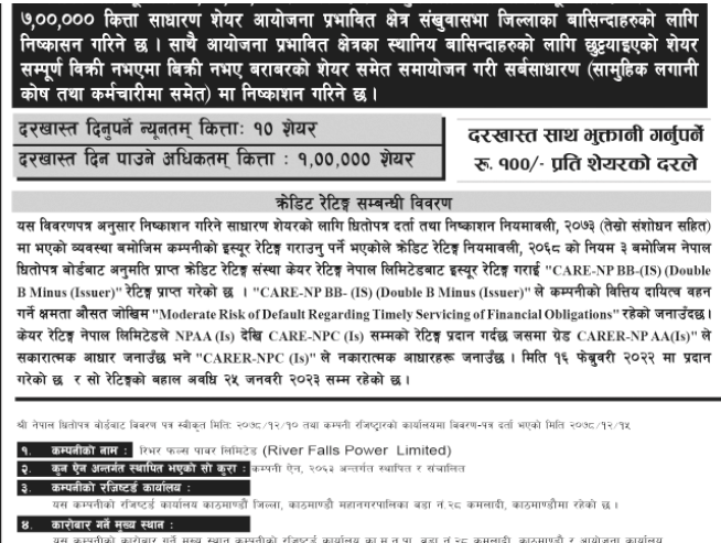 काठमाडौं । रिभर फल्स पावर लिमिटेडले चैत २७ गतेदेखि पहिलो चरणमा आयोजना प्रभावित स्थानीय वासिन्दाहरुका लागि आइपीओ विक्री गर्न लागेको छ । कम्पनीले स्थानीयमा जारी पूँजी ७० करोडको १० प्रतिशतले हुन आउने प्रतिशेयर१ सय रुपैयाँअंकित दरमा कुल ७ लाख कित्ता आइपीओ विक्री गर्न लागेको हो ।