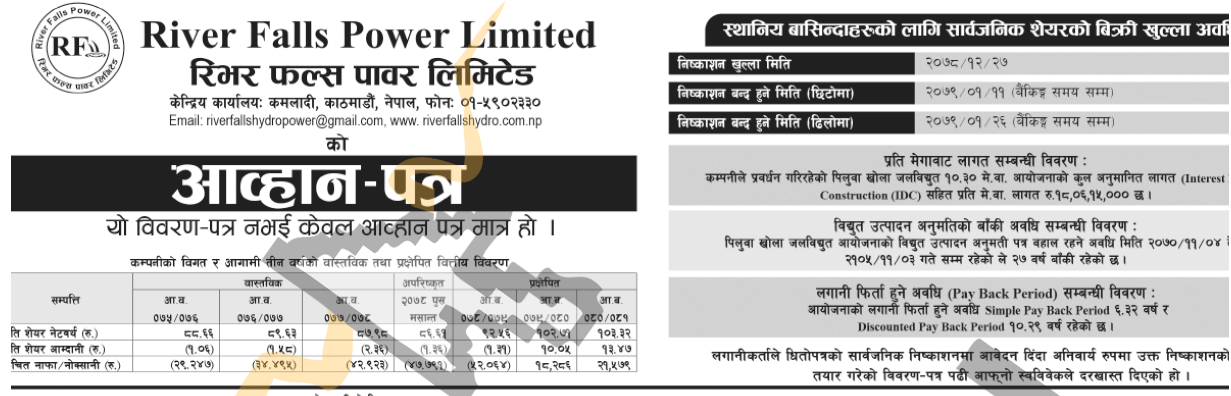 काठमाडौं । रिभर फल्स पावर लिमिटेडले चैत २७ गतेदेखि पहिलो चरणमा आयोजना प्रभावित स्थानीय वासिन्दाहरुका लागि आइपीओ विक्री गर्न लागेको छ । कम्पनीले स्थानीयमा जारी पूँजी ७० करोडको १० प्रतिशतले हुन आउने प्रतिशेयर१ सय रुपैयाँअंकित दरमा कुल ७ लाख कित्ता आइपीओ विक्री गर्न लागेको हो ।