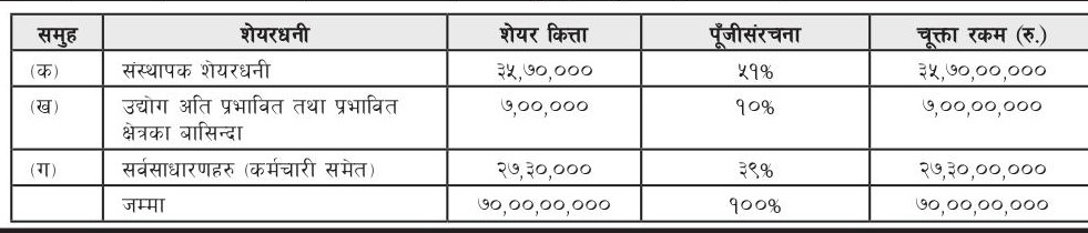 हाल कम्पनीको चुक्ता पूँजी ३५ करोड ७० लाख रहेको र साधारण शेयर बिक्री प्रक्रिया पश्चात कम्पनीको चुक्ता पूँजी ७० करोड हुन्छ । आईपीओ प्रक्रिया पश्चात कम्पनीमा सस्थापक शेयरको हिस्सा ५१ प्रतिशत हुने छ भने उद्योग अति प्रभावित तथा प्रभावित क्षेत्रका बासिन्दाको हिस्सा १० प्रतिशत र कर्मचारी सहित सर्वसाधारणहरु साधारण शेयरको हिस्सा ३९ प्रतिशत हुने छ।