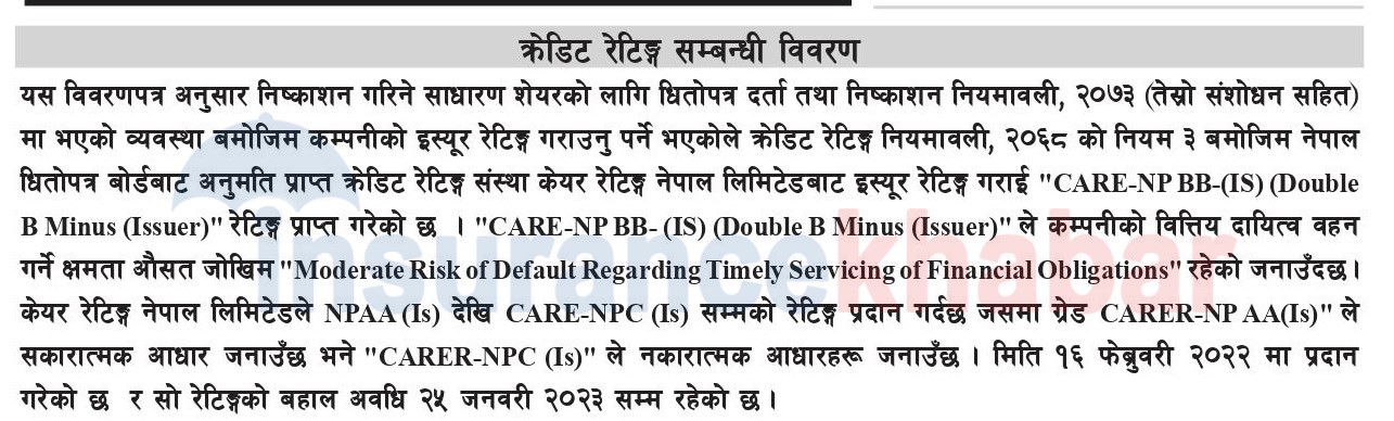 कम्पनीले नेपाल धितोपत्र बोर्डबाट अनुमति प्राप्त क्रेडिट रेटिङ्ग संस्था केयर रेटिङ्ग नेपाल लिमिटेडबाट इस्यूर रेटिङ्ग गराई “CARE-NP BB-(IS) (Double B Minus (Issuer)” रेटिङ्ग प्राप्त गरेकोछ । “CARE-NP BB-(IS) (Double B Minus (Issuer)” ले कम्पनीको वित्तिय दायित्व वहन गर्ने क्षमता औसत जोखिम”Moderate Risk of Default Regarding Timely Servicing of Financial Obligations” रहेको जनाउँदछ ।