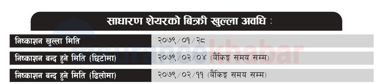 आईपीओ वैशाख २८ गते देखि जेष्ठ ४ गते सम्म खुल्ने छ । जेष्ठ ४ गते बैंकिङ्ग समय पश्चात आवेदन दिन सकिने छैन । यदि जेष्ठ ४ गते सम्म पनि सम्पूर्ण शेयर कित्तामा आवेदन नपरेको अवस्थामा जेष्ठ ११ गते सम्म समय थपिने छ । विगत देखिको तथ्याङ्क अनुसार समय थपिने सम्भावना एकदमै न्यून जस्तै छ ।