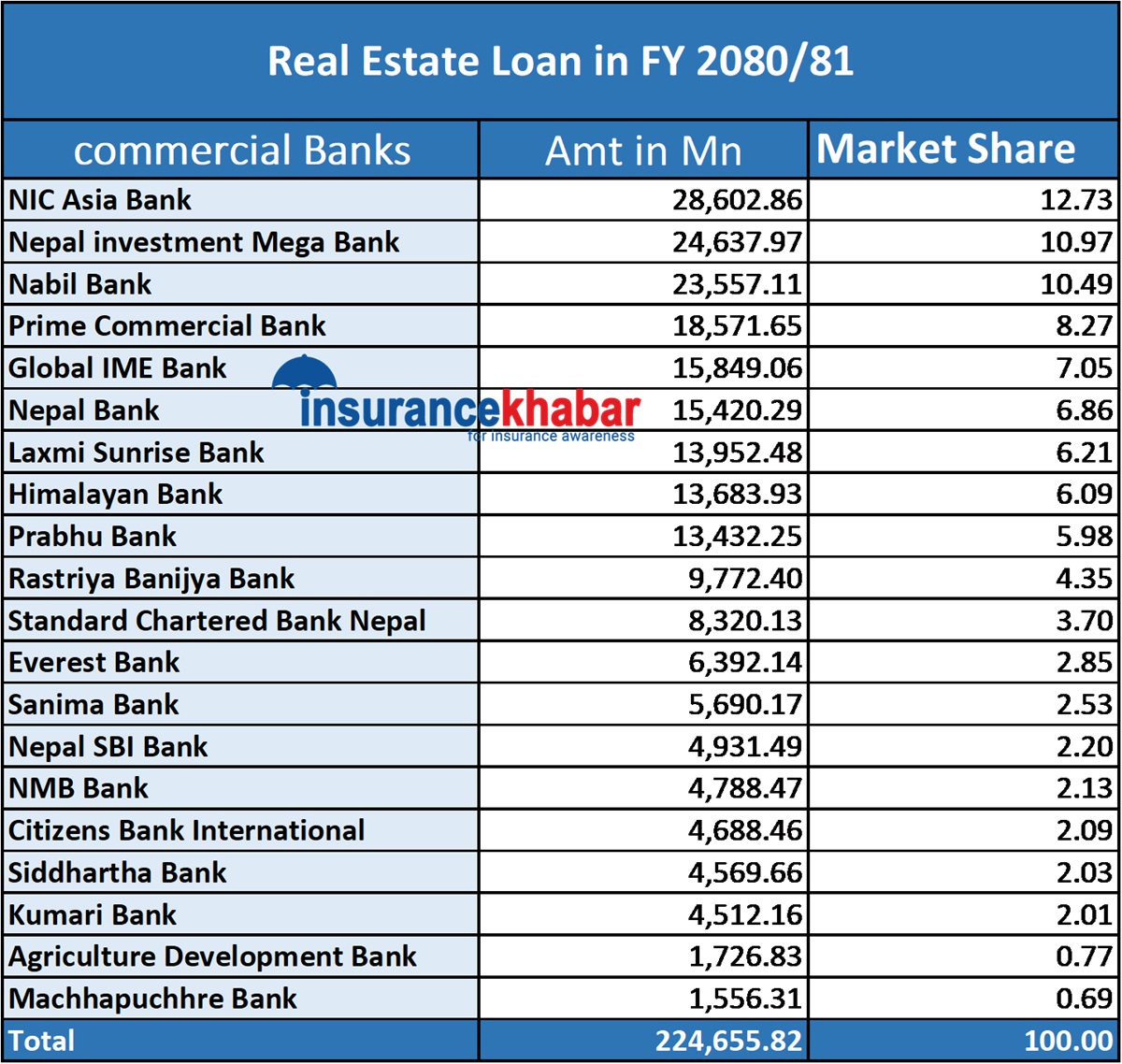 सबैभन्दा बढी रियल स्टेट कर्जा प्रवाह गर्नेमा एनआईसी एसिया बैंक रहेको छ। यो बैंकले मात्रै २८ अर्ब ६० करोड २८ लाख रुपैयाँ रियल स्टेट कर्जा प्रवाह गरेको छ। वाणिज्य बैंकहरुको कुल रियल स्टेट कर्जाको यो १२.७३ प्रतिशत हिस्सा हो।