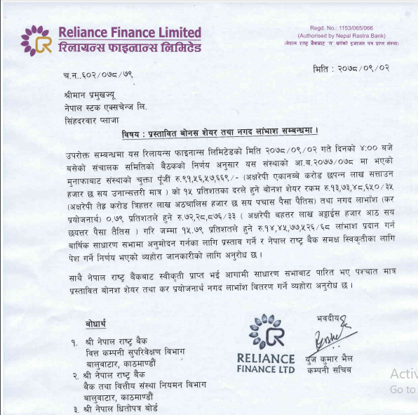 काठमाडौं । रिलायन्स फाइनान्स लिमिटेडले आर्थिक वर्ष २०७७/७८ को मुनाफाबाट आफ्ना शेयरधनीलाई कुल १५ दशमलव ७९ प्रतिशत लाभांश वितरण गर्ने प्रस्ताव गरेको छ । कम्पनीले १५ प्रतिशत बोनश शेयर र शून्य दशमलव ७९ प्रतिशत नगद लाभांश कर प्रयोजनको लागि गरेर कुल १५ दशमलव ७९ प्रतिशत लाभांश वितरण गर्ने प्रस्ताव गरेको हो ।