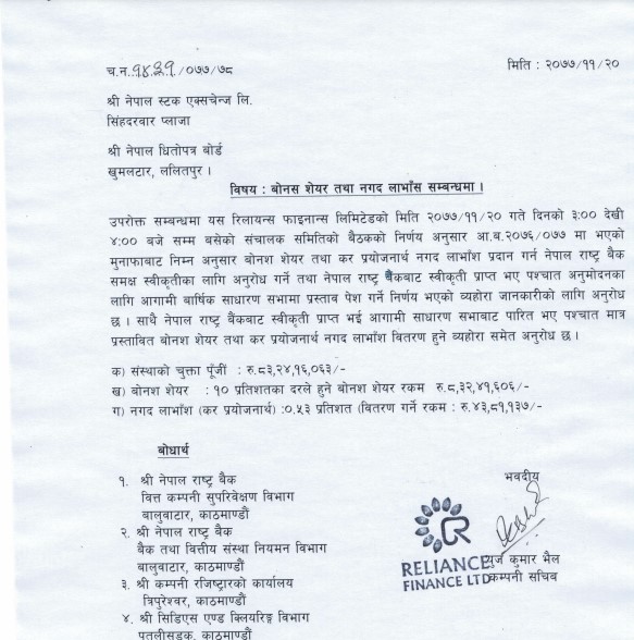 काठमाडौं । रिलायन्स फाइनान्सले १० दशमलव ५३ प्रतिशत लाभांश घोषणा गरेको छ । फाइनान्सको बिहीबार बसेको संचालक समिति बैठकले आर्थिक वर्ष २०७६/७७ को मुनाफाबाट १० प्रतिशत बोनस शेयर र ० दखमलव ५३ प्रतिशत नगद लाभांश वितरण गर्ने निर्णय गरेको हो ।