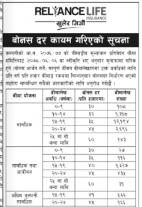 कम्पनीले निर्धारण गरेको बोनश दर मृत्यु दाबी, चुक्ता मूल्य दाबी, अवधि भुक्तानी दाबी र चालु बीमालेखमा लागु हुनेछ । साथै अर्को बीमाङ्की मूल्यांकन अनुसार बीमा समितिबाट अर्को व्यवस्था गर्न स्वीकृत नभएसम्म उल्लेखित दाबीहरुमा समेत यहि बोनसदर लागु हुने कम्पनीले जनाएको छ ।