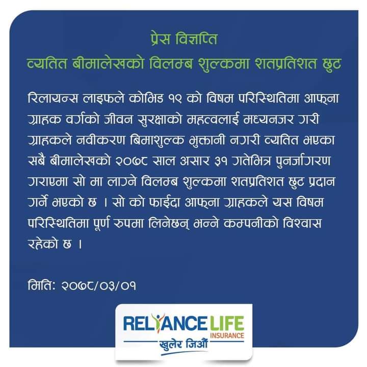 काठमाडौं । रिलायन्स लाइफ इन्स्योरेन्स कम्पनीले व्यतित बीमालेखको बिलम्व शुल्कमा शत प्रतिशत ब्याज छुट दिने भएको छ । कम्पनीले कोभिड १९ को विषम परिस्थितिमा आफ्ना ग्राहक वर्गको जीवन सुरक्षाको महत्वलाई मध्यनजर गरी ग्राहकले नवीकरण बीमा शुल्क भुक्तानी नगरी व्यतित भएका सबै बीमालेखको २०७८ साल असार ३१ गतेभित्र पुनर्जागरण गराएमा सो मा लाग्ने विलम्ब शुल्कमा शतप्रतिशत छुट प्रदान गर्ने जनाएको छ ।