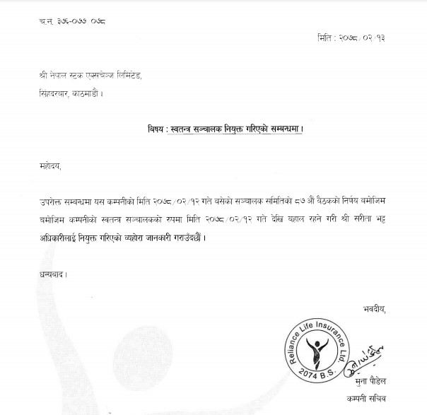 काठमाडौं । रिलायन्स लाइफ इन्स्योरेन्स कम्पनीको स्वतन्त्र संचालकमा सरिता भट्ट अधिकारी नियुक्त भएकि छिन् । कम्पनीले नेप्सेमार्फत एक सूचना जारी गर्दै यस्तो जानकारी दिएको हो ।