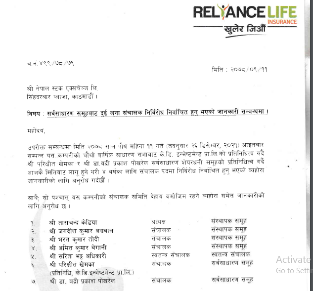 काठमाडौं । रिलायन्स लाइफ इन्स्योरेन्स कम्पनीमा सर्वसाधारण समूहबाट दुई जना सञ्चालक निर्विरोध निर्वाचित भएका छन् । कम्पनीको हिजो पुस ११ गते सम्पन्न वार्षिक साधारण सभाबाट परिक्षीत खेमका र डा. बद्री प्रकाश पोखरेल निर्विरोध निर्वाचित भएका हुन् । उनीहरुलाई कम्पनीको सभाले आगामी ४ वर्षका लागि सञ्चालक पदमा निर्विरोध निर्वाचित गरेको हो ।