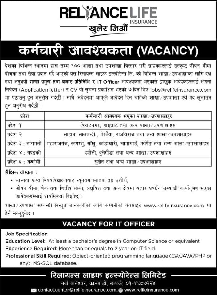 काठमाडौं । रिलायन्स लाइफ इन्स्योरेन्स कम्पनीले विभिन्न पदका लागि कर्मचारीको माग गरेको छ । कम्पनीले पाँच वटा प्रदेशका लागि कर्मचारीको माग गरेको जनाएको छ । कम्पनीले आइटी अफिसरका लागि पाँच प्रदेशका विभिन्न शाखा तथा उप शाखा कार्यालयका लागि कर्मचारीको माग गरेको बताएको छ