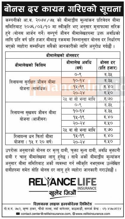 रिलायनस लाइफ इन्स्योरेन्सले बीमितहरुलाई दिने नयाँ बोनश दर घोषणा गरेको छ ।