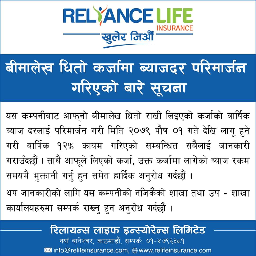काठमाडौं । रिलायन्स लाइफ इन्स्योरेन्स कम्पनीले बीमालेख धितो कर्जाको ब्याजदर परिमार्जन गरेको छ । कम्पनीले एक सुचना जारी गर्दै कम्पनीबाट आफ्नो बीमालेख धितो राखी लिइएको कर्जाको वार्षिक ब्याजदर परिमार्जन गरेको जनाएको छ ।