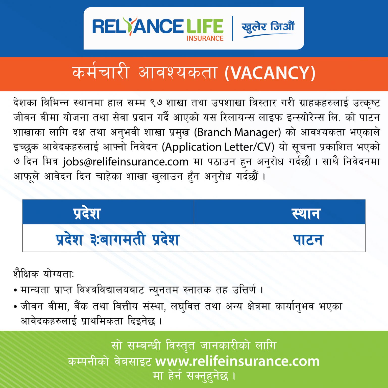 काठमाडौं । रिलायन्स लाइफ इन्स्योरेन्स कम्पनीले कर्मचारीको माग गरेको छ । कम्पनीले बागमति प्रदेश पाटन शाखा कार्यालयका लागि कर्मचारीको माग गरेको जनाएको छ । कम्पनीले पाटन शाखामा ब्रान्च म्यानेजरका लागि कर्मचारी माग गरेको हो ।